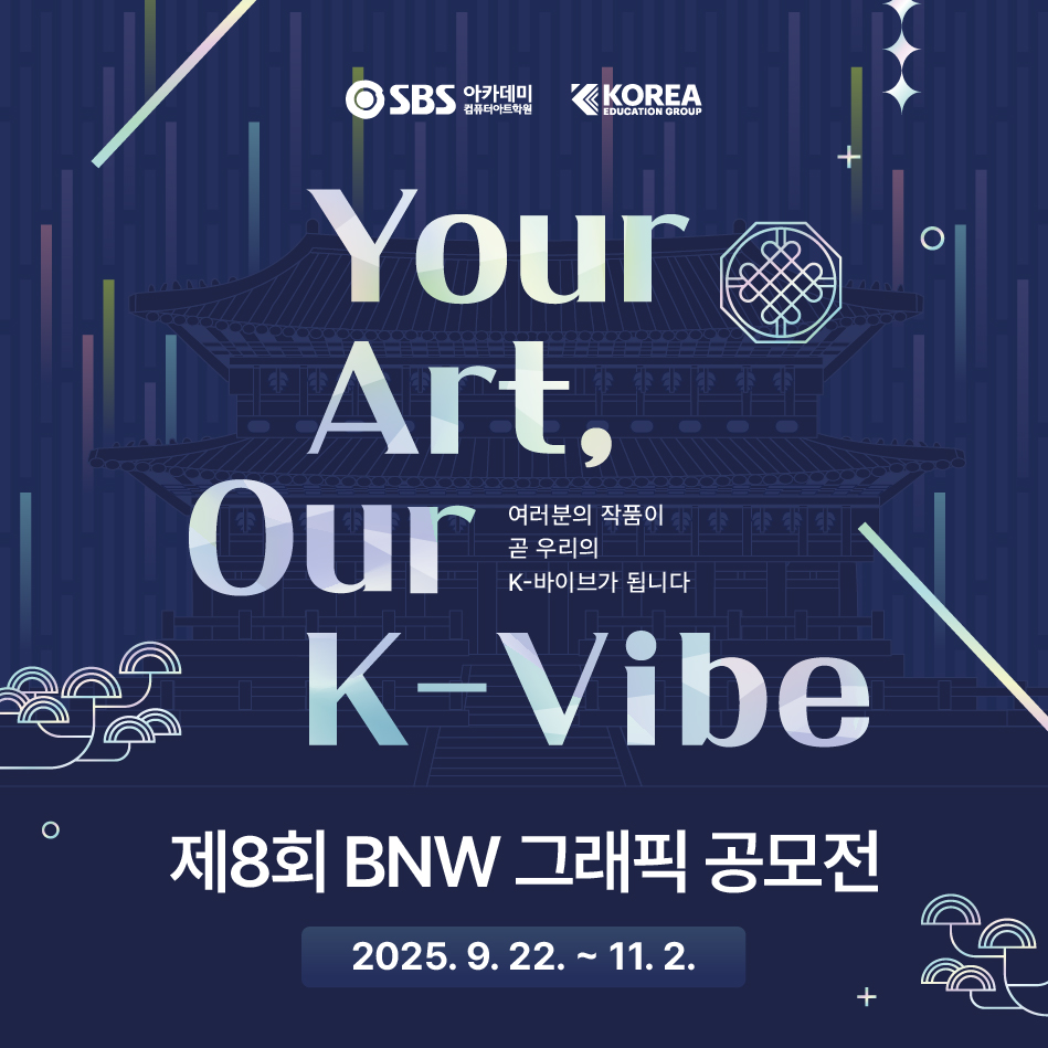 전 세계가 K-문화에 열광하고 있습니다. 그래픽 디자인 분야에서도 한국적 감성과 아이디어가 글로벌 트렌드를 이끌어가고 있습니다. 제8회 BNW 그래픽디자인공모전은 한국의 전통적 미학과 현대적 감각을 융합한 새로운 K-디자인의 주역을 발굴합니다.