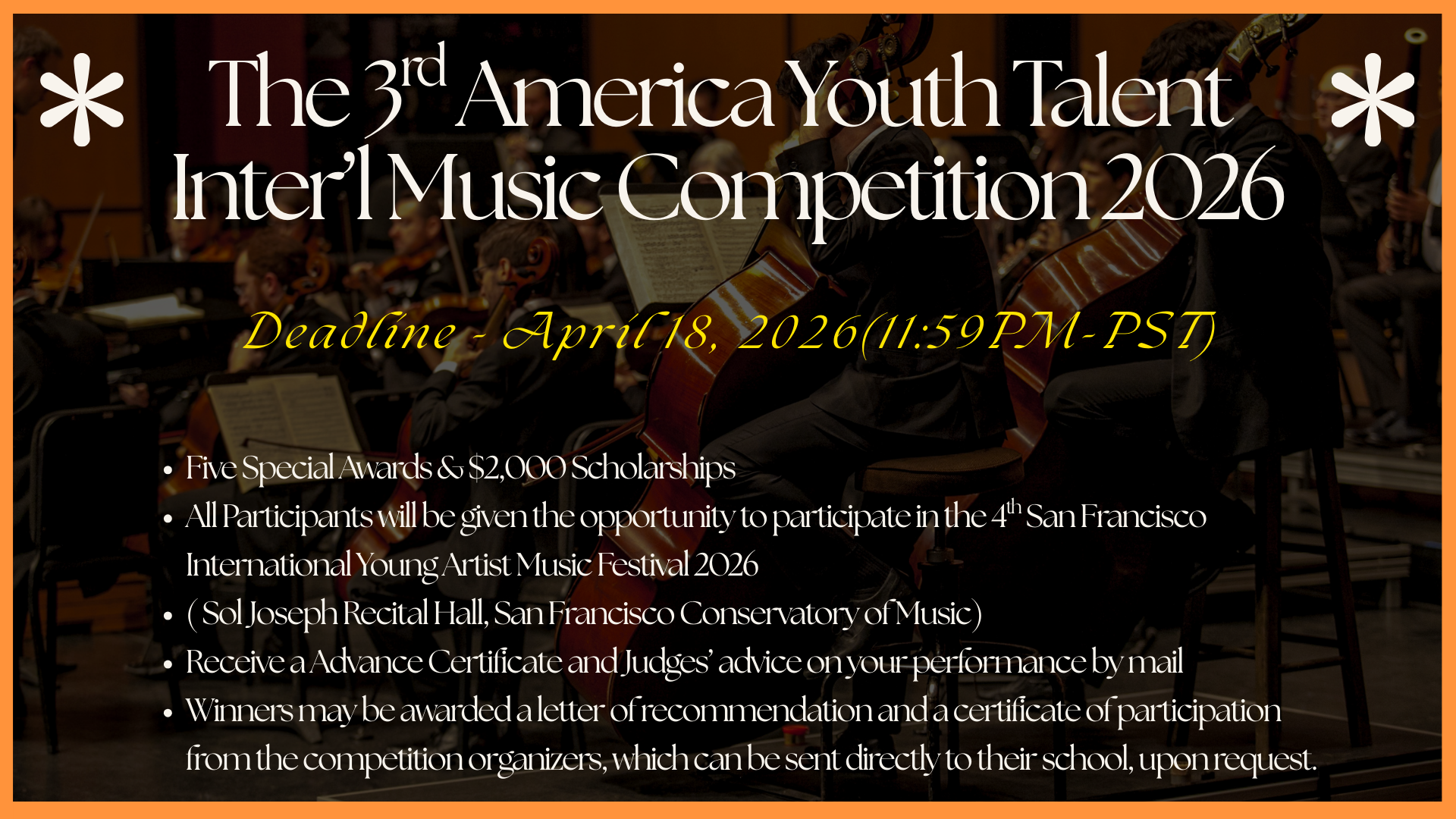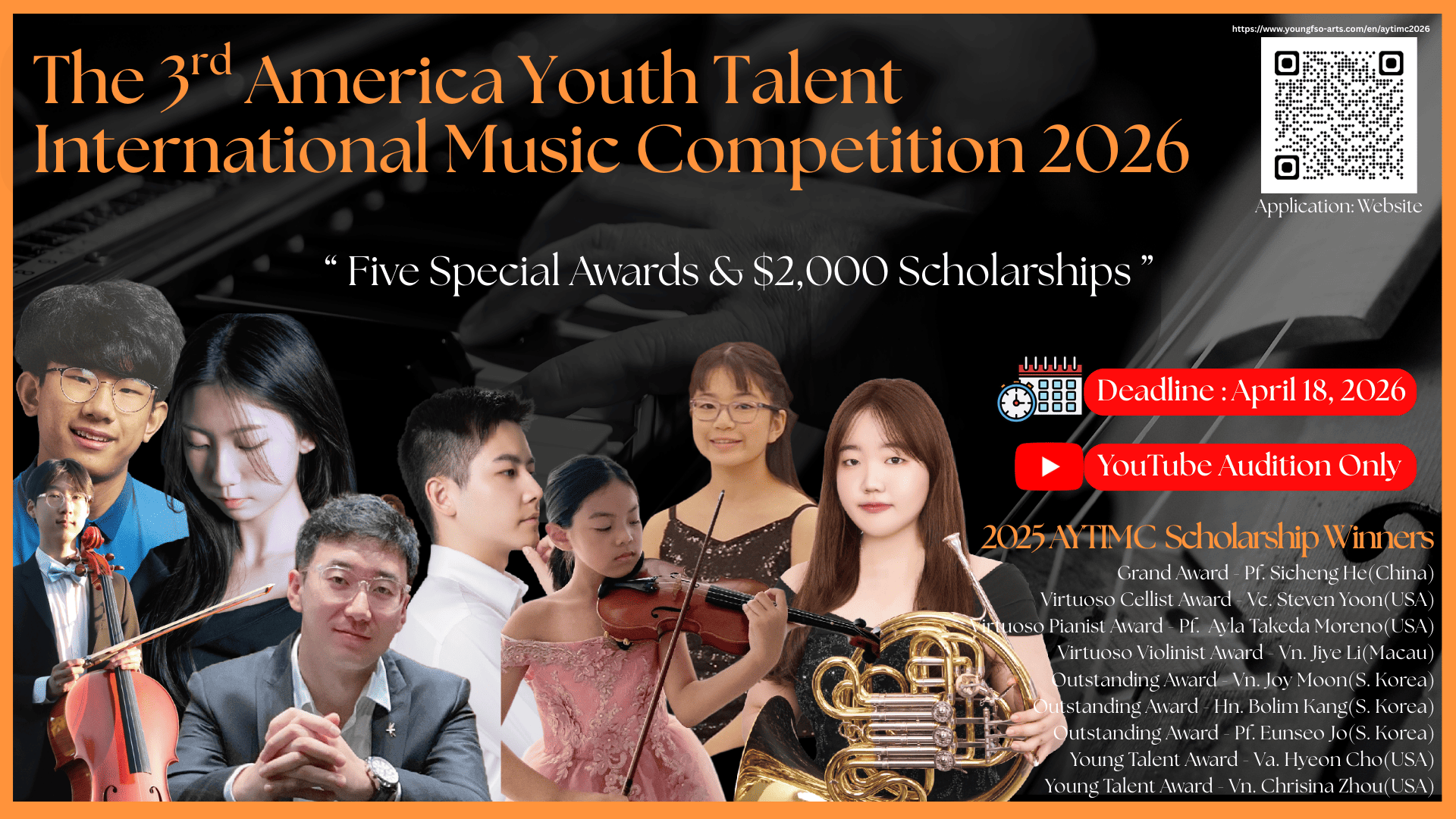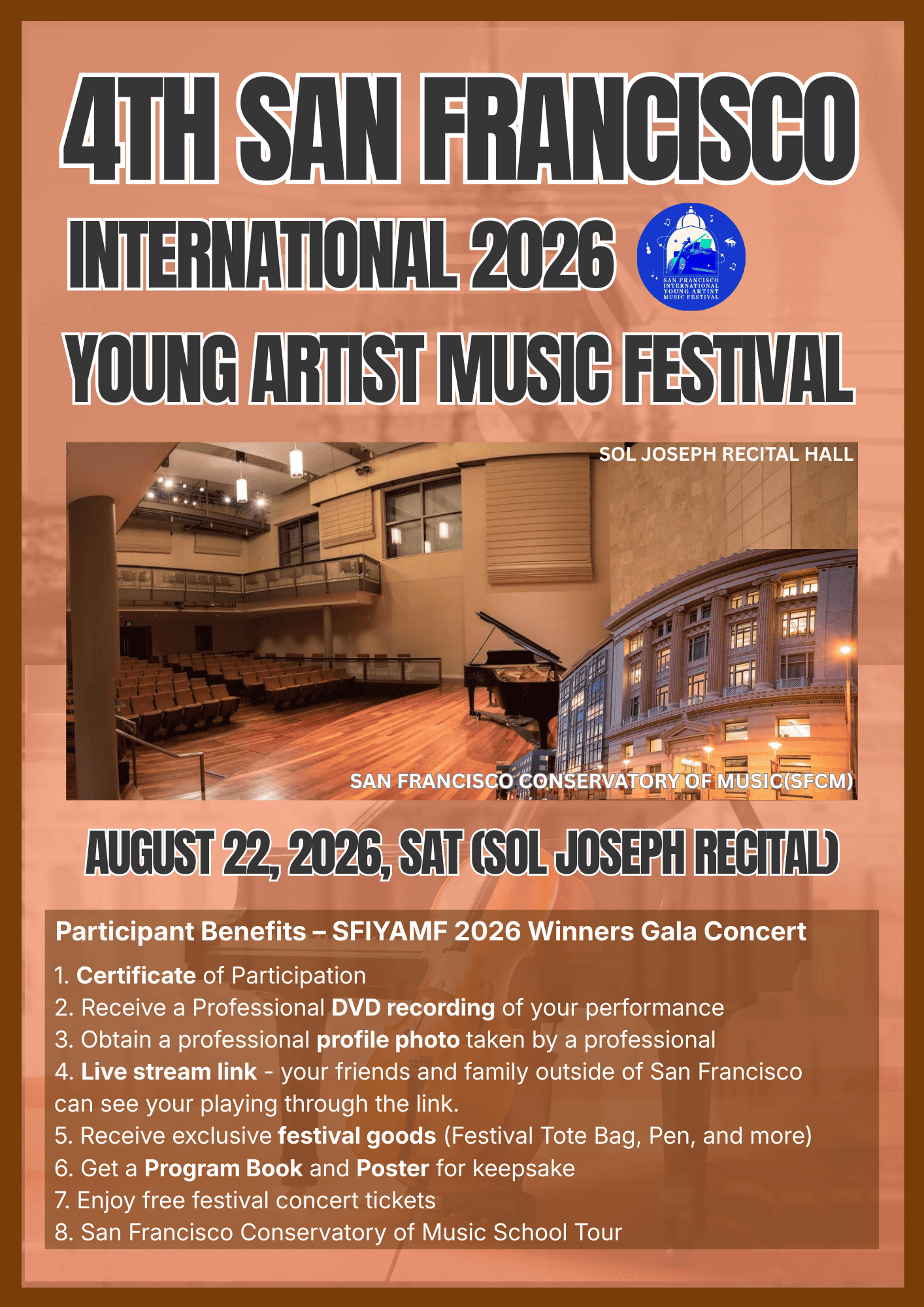 - 제 4회 샌프란시스코 국제 음악 페스티벌 참가 기회 부여(2026년 8월 22일, 샌프란시스코 음악원 - Sol Joseph Recital Hall)