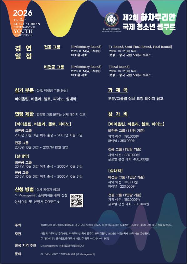 | 주최 . 주관 | 아르메니아 교육과학문화체육부 / 중국 국립 오페라 하우스 아람 하차투리안 문화재단 / JINGSE (북경) 국제 교육 기술 유한공사/아람 하차투리안 문화재단 / 하차투리안 국제 콩쿠르 조직위원회 JINGSE (북경) 국제 교육 기술 유한공사 / 주 아르메니아 중화인민공화국 대사관 주 중국 아르메니아 대사관 / M Management / 서울중앙음악학원(SCC) |