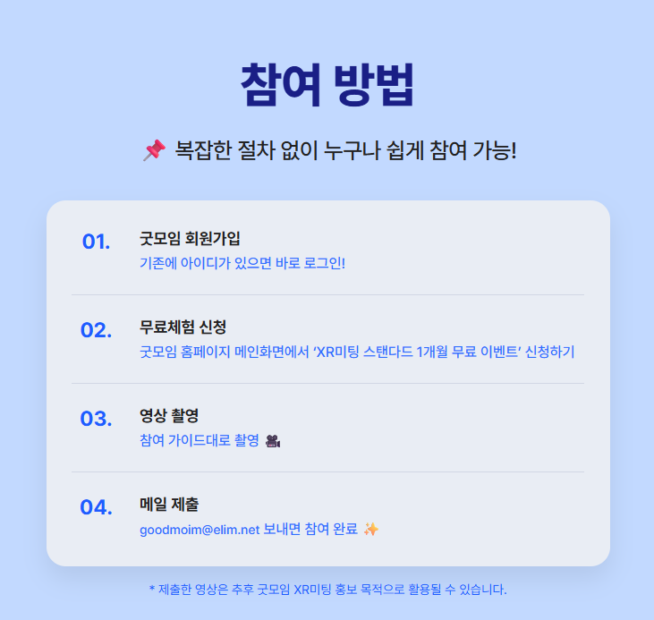 * 제출한 영상은 추후 굿모임 XR미팅 홍보 목적으로 활용될 수 있습니다.