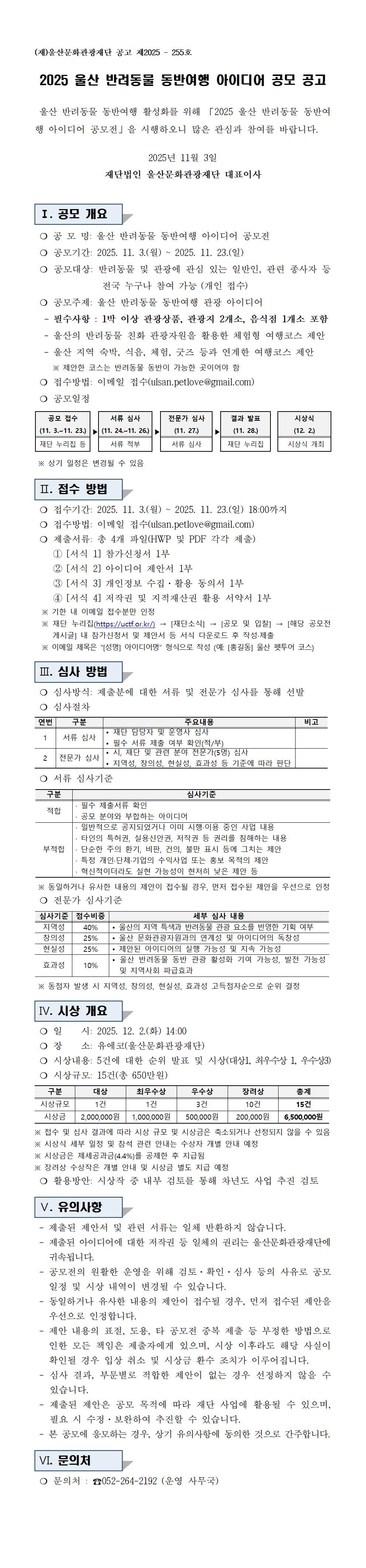 ※ 이메일 제목은 “[성명] 아이디어명” 형식으로 작성 (예: [홍길동] 울산 펫투어 코스)