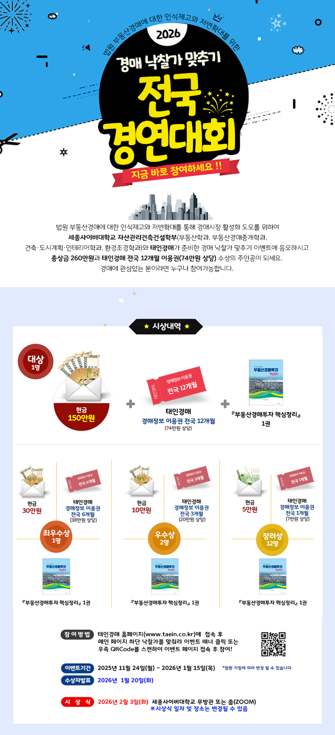 | 시상내역 | 상금+상품(총상금 : 260만원 / 1위 : 150만원 / 태인경매 전국1년 이용권 (74만원)) |