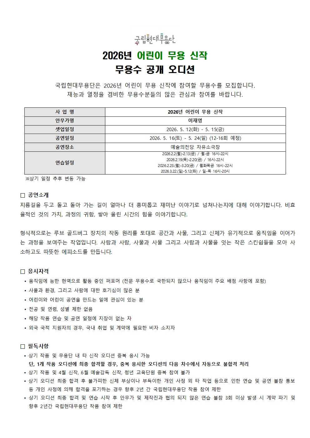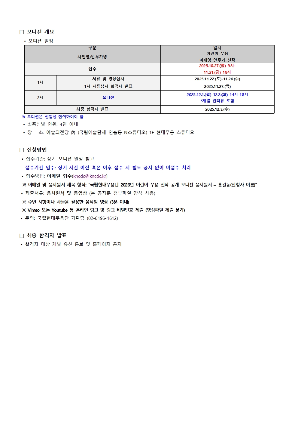 ※ 이메일 및 응시원서 제목 형식: "국립현대무용단 2026년 어린이 무용 신작 공개 오디션 응시원서 - 홍길동(신청자 이름)"