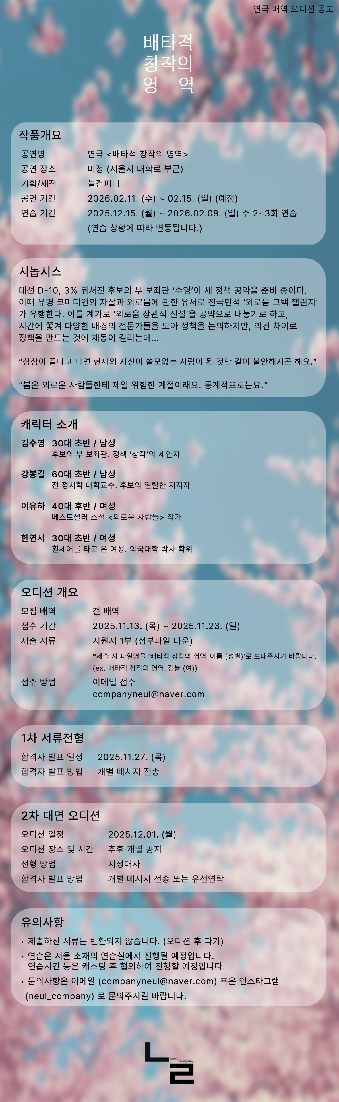 - 연습시간 등은 캐스팅 후 협의하여 진행할 예정입니다.