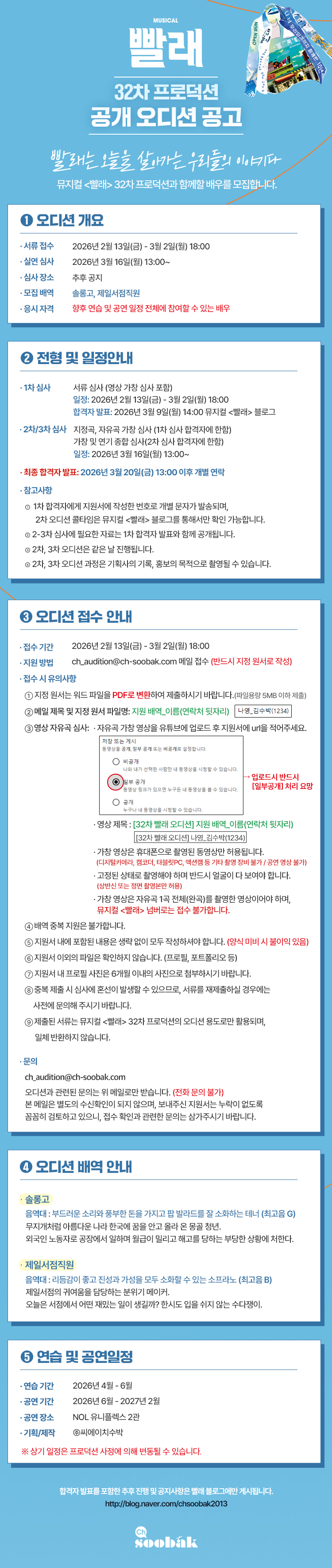 합격자 발표: 2026년 3월 9일(월) 14:00 뮤지컬 <빨래> 블로그