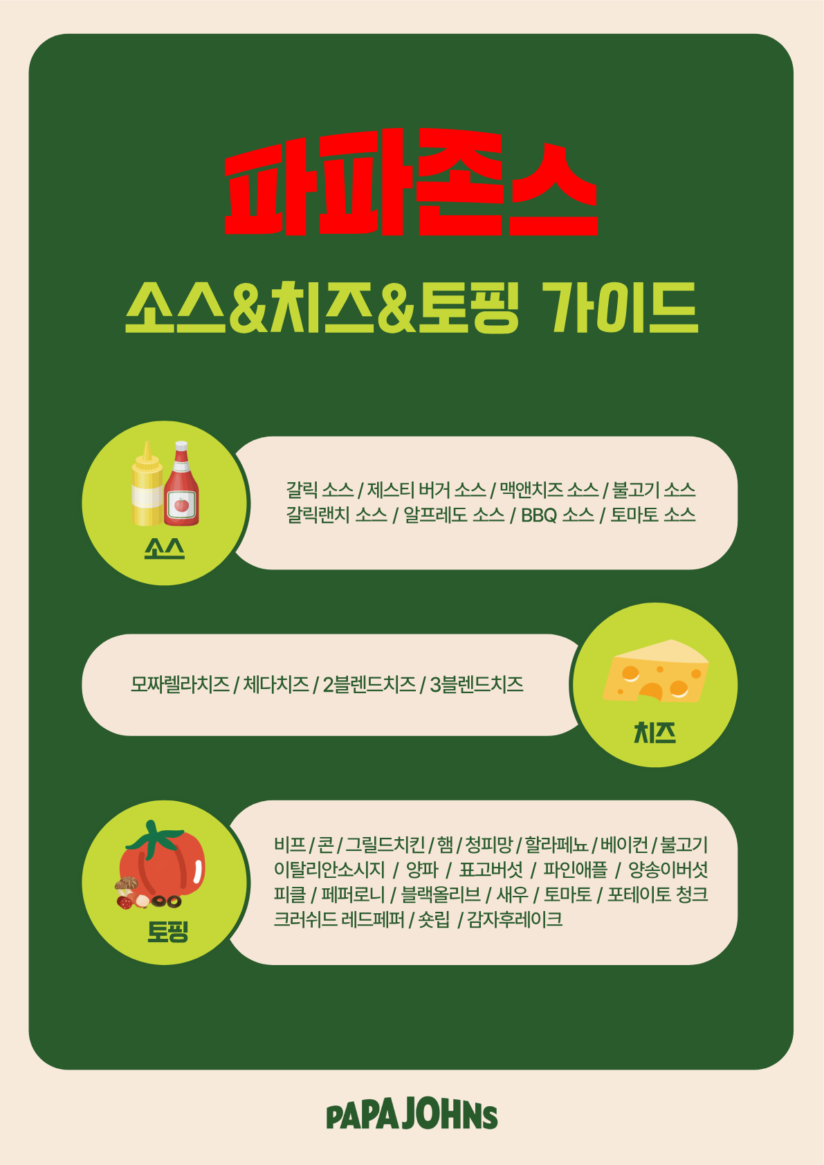 소스 & 치즈 & 토핑 가이드는 아래 이미지를 참고해주세요.