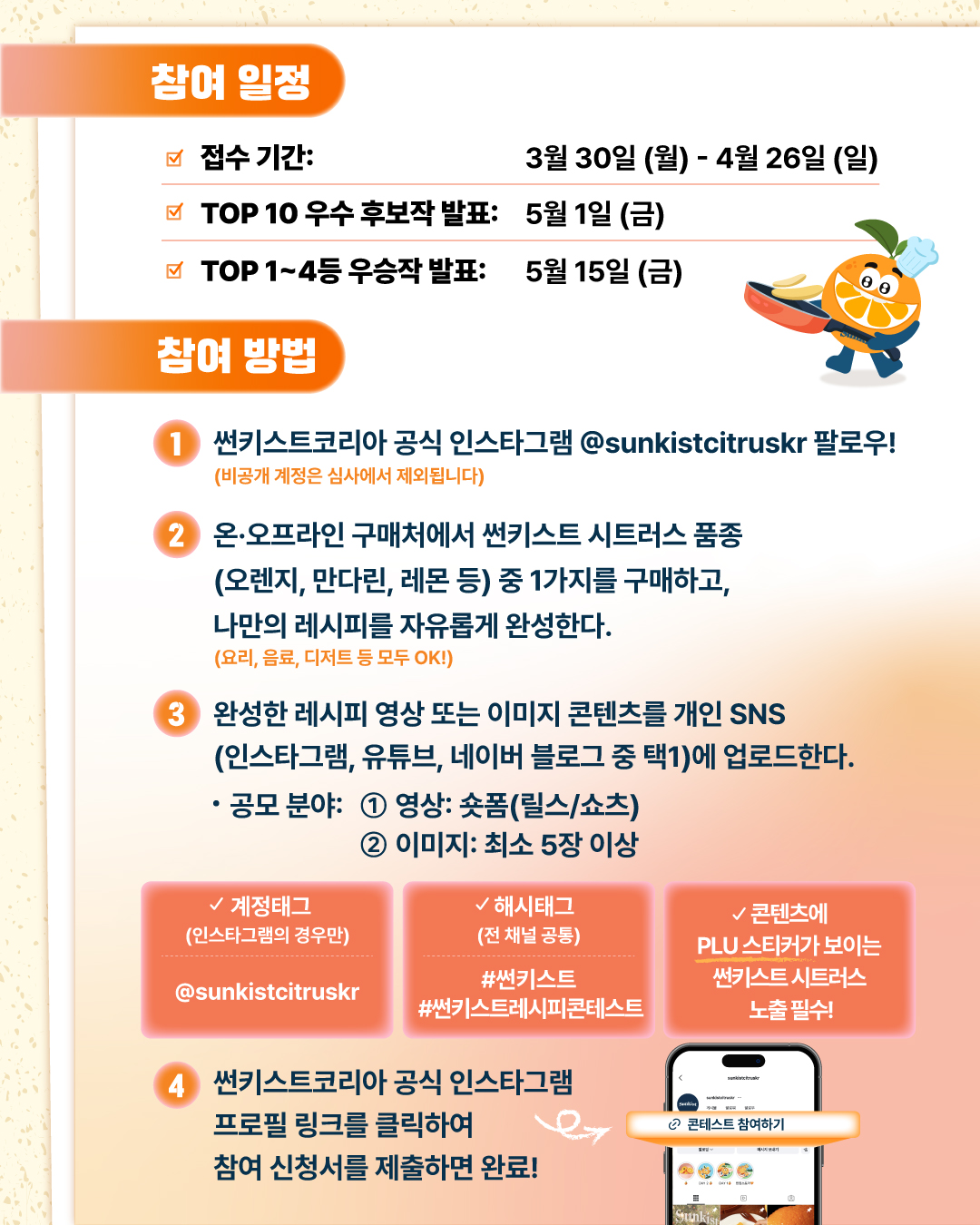 1. 썬키스트코리아 공식 인스타그램 @sunkistcitruskr 팔로우하기 (비공개 계정은 심사에서 제외됩니다)
