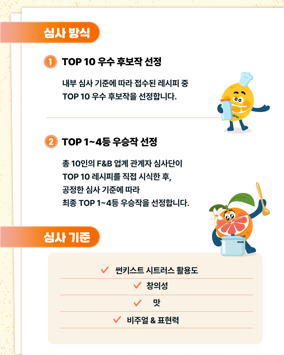 - 1~10등 수상작은 썬키스트의 홍보 콘텐츠에 활용될 수 있으며, 필요 시 수상작의 일부를 변경하여 사용될 수 있습니다.