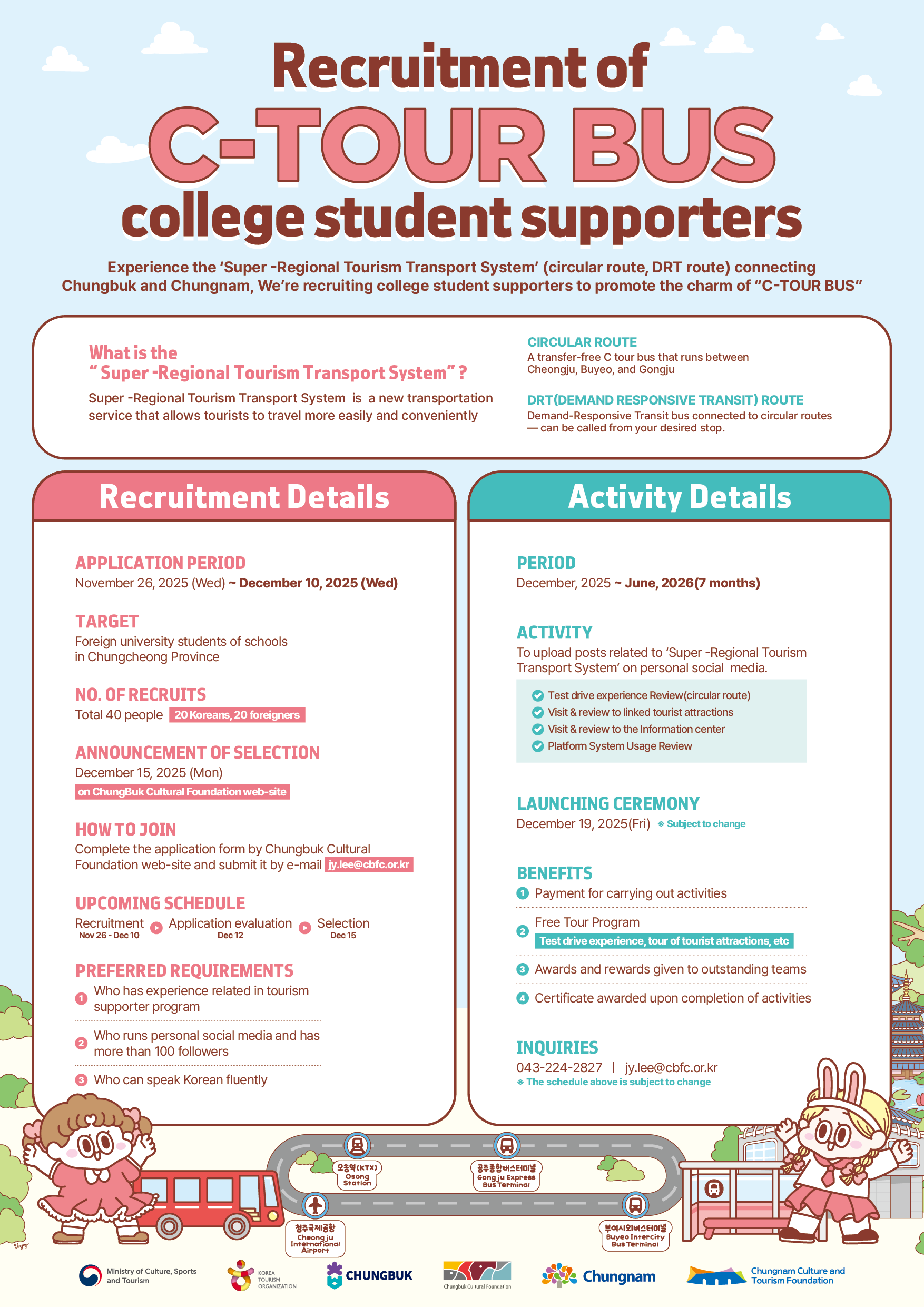 (재)충북문화재단은 충북–충남을 잇는 초광역형 관광교통망(순환·DRT노선)과 주요 관광지를 홍보하기 위해 ‘C-투어버스 대학생 서포터즈’를 아래와 같이 모집합니다.