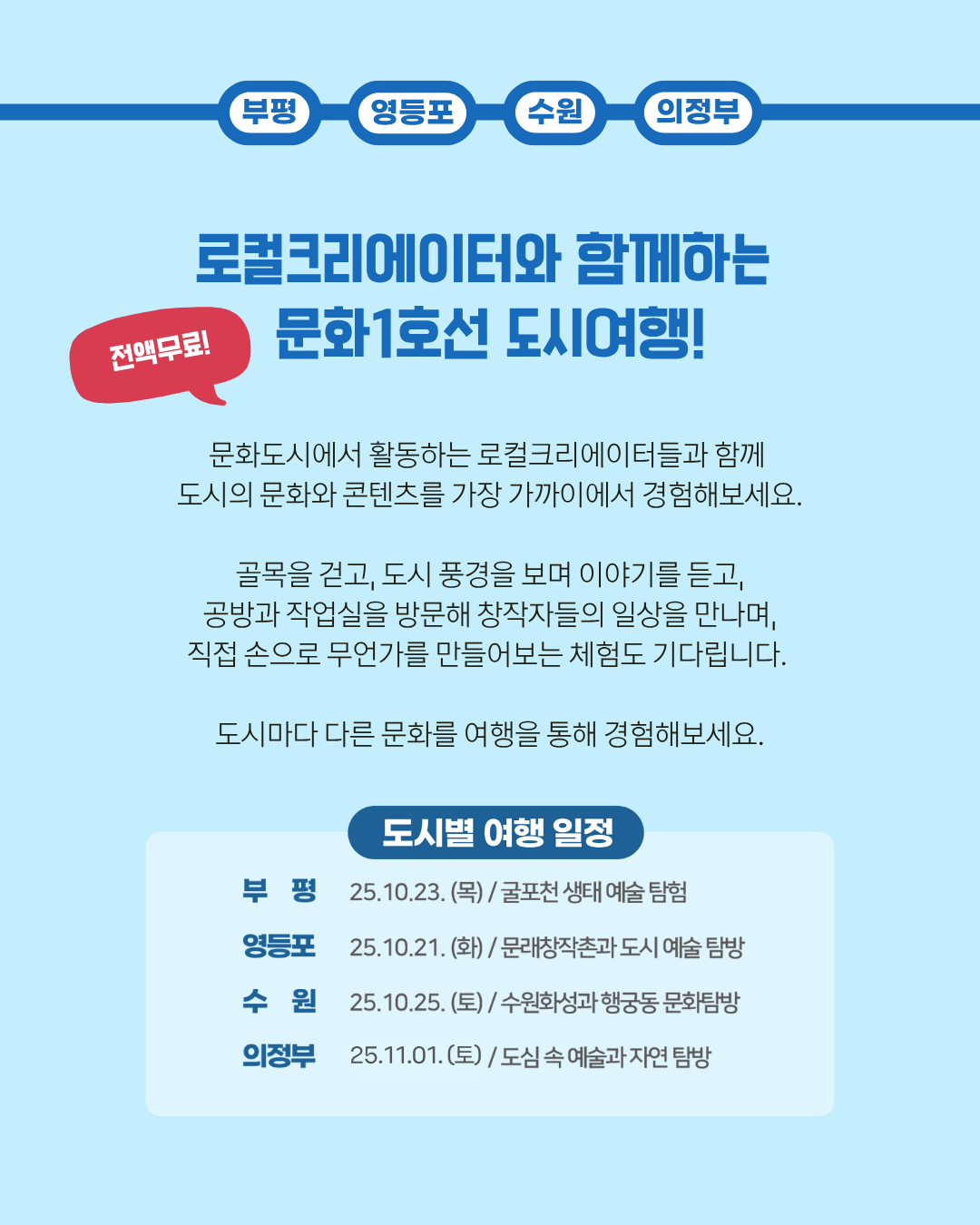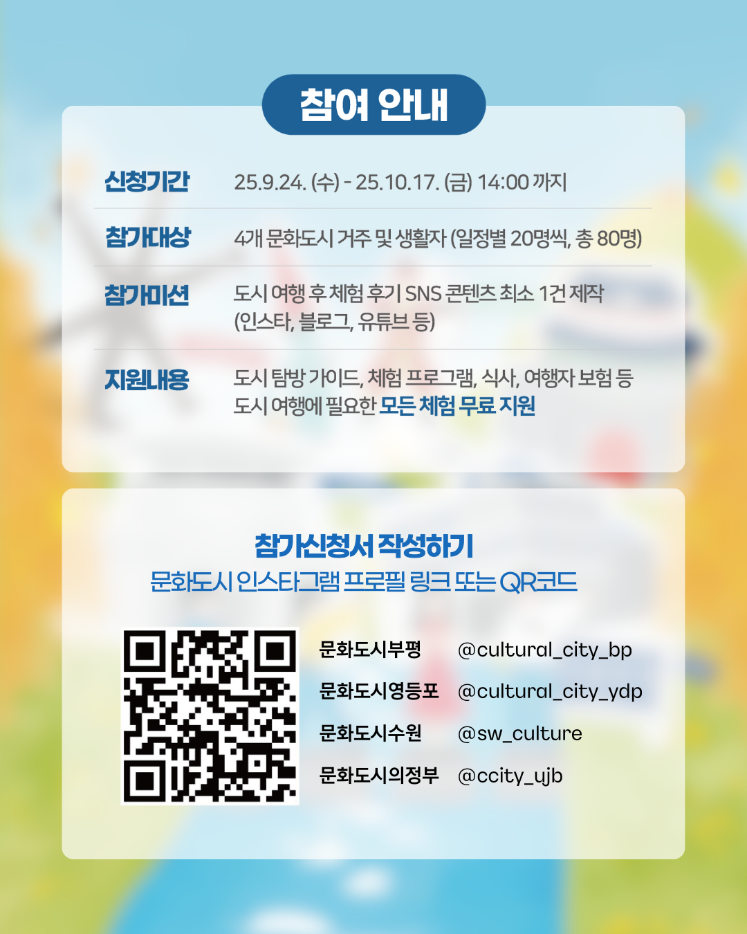 도시 탐방 가이드, 체험 프로그램, 식사, 여행자 보험 등 도시여행에 필요한 모든 체험 무료 지원 (도시별 기념품 제공)