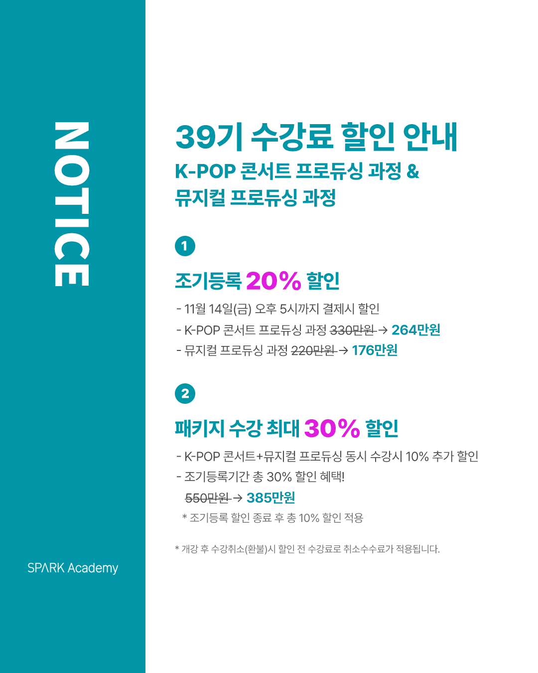- KPOP 콘서트 프로듀싱 과정 + 뮤지컬 프로듀싱 과정 동시 수강시 10% 추가할인