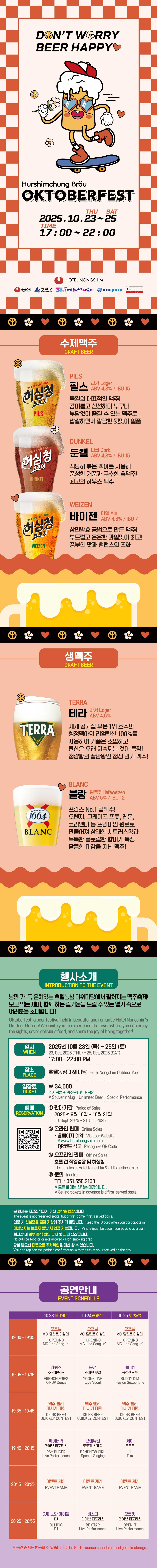 올해로 19회를 맞이하는 2025 허심청브로이 옥토버페스트가 오는 10월 23일부터 25일까지 3일간 부산 호텔농심 야외마당에서 개최됩니다. 이번 축제는 ‘DON’T WORRY BEER HAPPY’라는 슬로건 아래, 걱정 없이 행복을 꿈꾸는 낭만 가득한 청춘들을 위한 맥주 축제로 기획되었다. 허심청 브루마스터가 직접 제조한 필스, 둔켈 등 정통 독일식 수제맥주를 무제한으로 즐길 수 있으며, 호텔 셰프가 준비한 다양한 음식과 함께 흥겨운 공연, 이색 퍼포먼스, 참여형 프로그램 등 다채로운 즐거움이 펼쳐집니다.