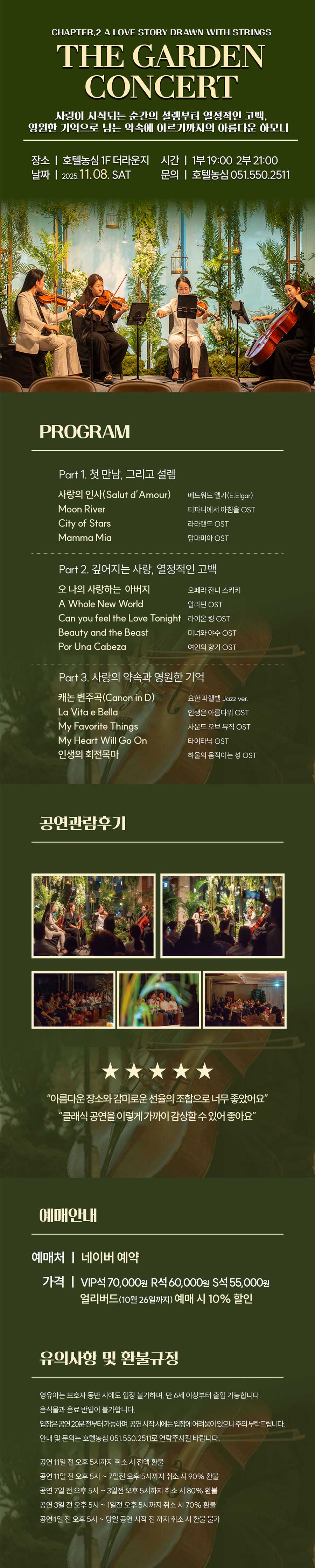 푸른 정원의 싱그러움이 가득한 곳에서 펼쳐지는 '더 가든 음악회'입니다. 몽환적인 조명 아래 감미로운 선율이 흐르는 아름다운 무대에서 특별한 밤을 경험하세요.