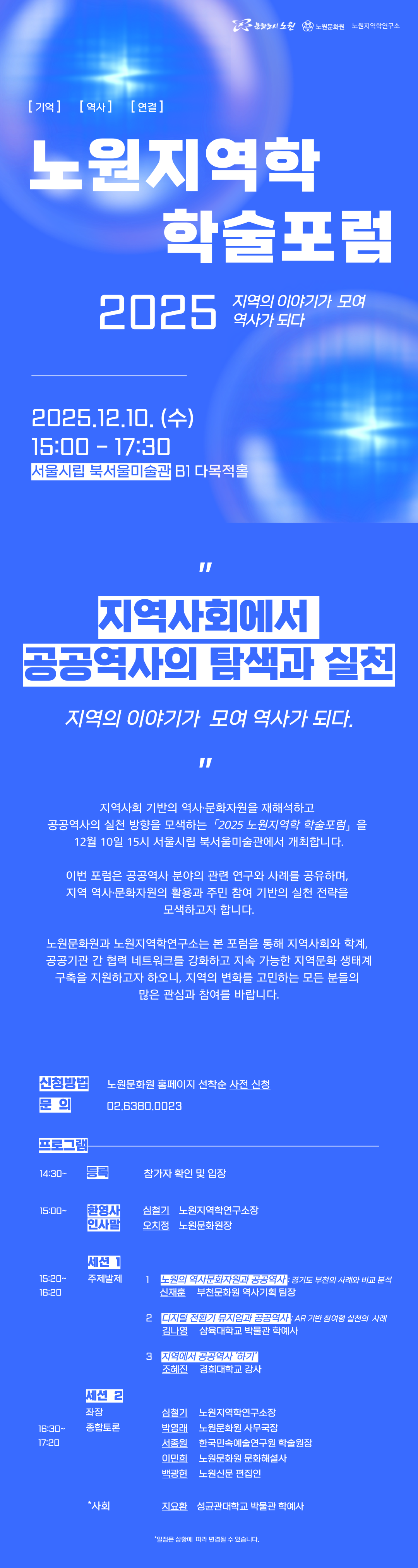 안녕하세요~ 노원문화원과 노원지역학연구소는 노원지역의 역사·문화자원을 새롭게 해석하고, 공공역사의 방향과 실제 사례를 나누고자 「2025 노원지역학 학술포럼」을 개최합니다:D