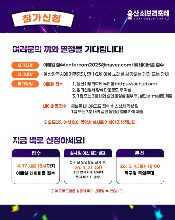 접수 된 동영상을 심사 후, 26.4.21.(화) 예선 합격자에 한하여 문자 메시지 발송