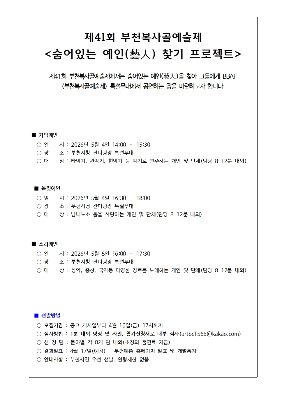 -제41회 부천복사골예술제에서는 숨어있는 예인(藝人)을 찾아 그들에게 BBAF (부천복사골예술제) 특설무대에서 공연하는 장을 마련하고자 합니다.