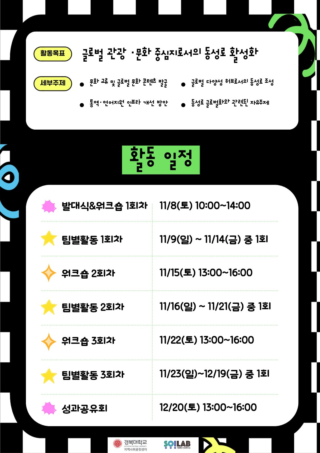 발대식, 워크숍, 팀별 현장 활동, 성과 공유회 등 알찬 프로그램으로 구성되어 있습니다.
