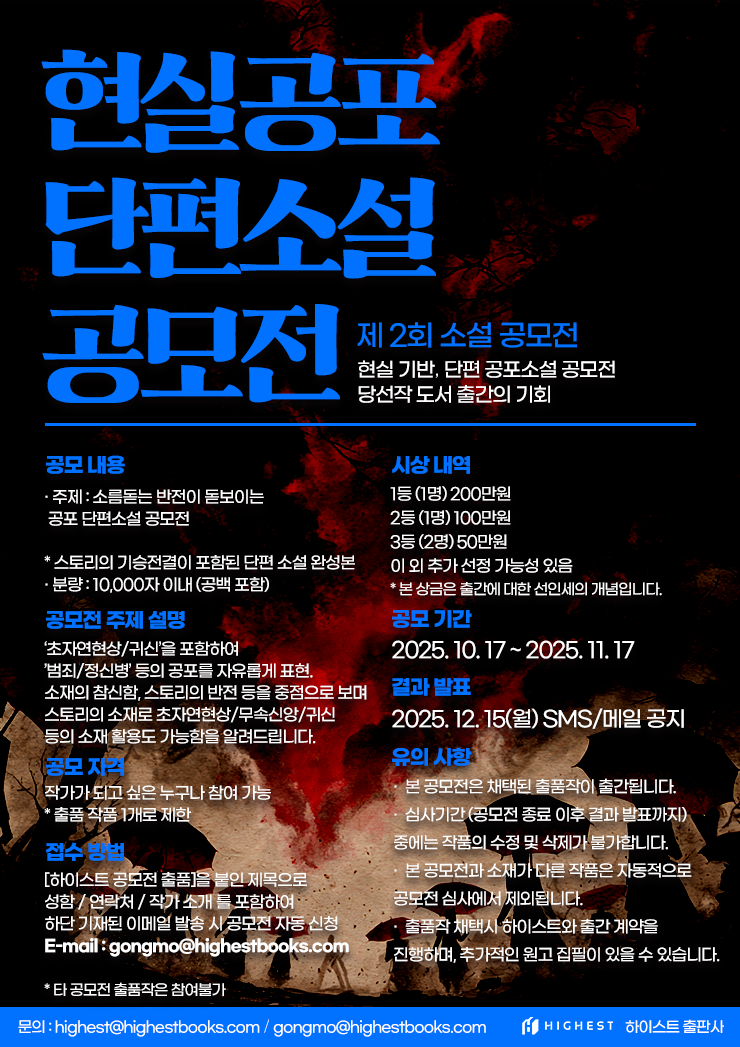 - 출품작 채택시 하이스트와 출간 계약을 진행하며, 추가적인 원고 집필이 있을 수 있습니다.