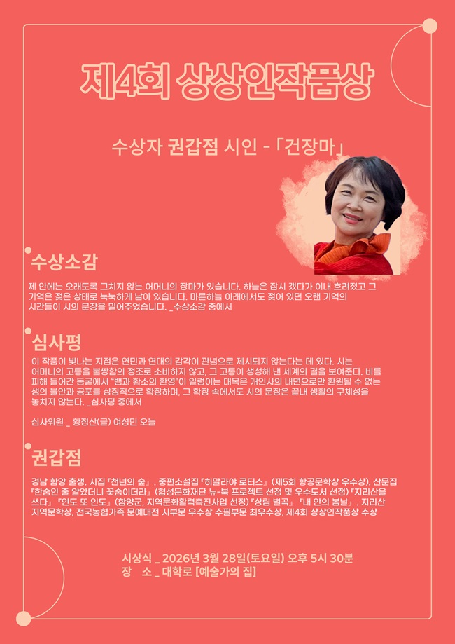 권갑점 시인은 2005년 시집 '천년의 숲'으로 작품활동을 시작하였고 중편소설집 '히말라야 로터스'(제5회 항공문학상 우수상), 산문집 '한숨인 줄 알았더니 꽃숨이더라'(협성문화재단 뉴-북 프로젝트 선정 및 우수도서 선정), '지리산을 쓰다', '인도 또 인도'(함양군, 지역문화활력촉진사업 선정) 등이 있다. 지리산 지역문학상, 제4회 상상인작품상을 수상하였다. 권갑점 시인의 「건장마」 작품이 빛나는 지점은 연민과 연대의 감각이 관념으로 제시되지 않는다는 데 있으며 시는 어머니의 고통을 불쌍함의 정조로 소비하지 않고, 그 고통이 생성해 낸 세계의 결을 보여준다. 비를 피해 들어간 동굴에서 “뱀과 황소의 환영”이 일렁이는 대목은 개인사의 내면으로만 환원될 수 없는 생의 불안과 공포를 상징적으로 확장하며, 그 확장 속에서도 시의 문장은 끝내 생활의 구체성을 놓치지 않았다고 심사평을 했다. 올해 심사는 황정산, 여성민, 오늘 세 분이 맡았다. 상상인작품상의 상금은 300만원이며 시상식은 2026년 3월 28일 대학로 <예술가의 집>에서 오후 5시 30분에 열린다.