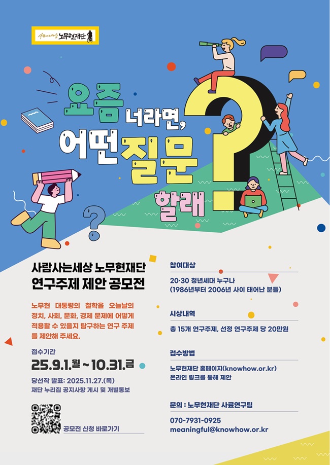 사람사는세상 노무현재단(이사장 차성수, 이하 재단)은 노무현 대통령을 직접 경험하지 않은 청년 세대의 시선으로 대통령의 철학과 가치를 재해석하고 새로운 연구 의제를 발굴하기 위해 ‘연구주제 제안 공모전’을 개최한다.