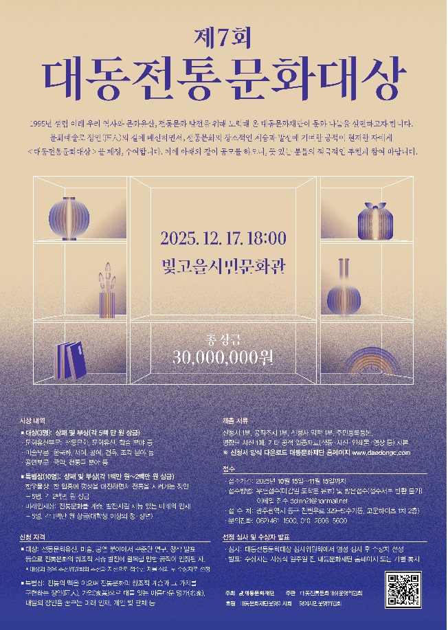 ![]() 전통문화 지킴이 단체인 사단법인 대동문화재단이 15일부터 '제7회 대동전통문화대상' 수상 후보자를 공개 접수한다. 대동전통문화대상은 지역의 문화예술 진흥 창달과 전통문화의 창조적 계승 발전에 현저한 공적이 있는 장인 및 미래 인재에게 수여하는 상이다. 시민들의 후원을 통해 민간 주체로 운영돼 올해로 7회째를 맞았다. 그간 총 80여명의 수상자를 배출했으며 우도농악 김동언 설장고 명인, 금봉 박행보 화백, 이학수 옹기장, 김정호, 이종일 향토사학자, 정인순 한복 명장 등 지역에서 전통문화 분야에 일로매진하며 업적을 쌓은 장인들에게 대상이 수여돼 왔다. 시상 분야는 문화유산 부문, 미술 부문, 공연부문 등 대상 3개 부문과 특별상 2개 부문이다. 대상 수상자에게는 각 500만원, 특별상의 한우물상은 각 200만원, 미래인재상은 각 100만원 등 총 3000만원의 상금이 수여된다. 특히 한 업종에 평생을 매진하면서 전통을 지키는 장인 5명에게 수여하는 한우물상과 전통문화를 계승 발전시킬 재능 있는 미래의 인재 5명에게 수여하는 미래인재상은 대동문화재단의 출범 정신과 가치와 맥을 같이 한다는 점에서 문화예술계의 주목을 받고 있다. 제출서류는 신청서 1부, 공적조서 1부, 신청자 약력 1부, 주민등록등본 등 공적 입증자료를 대동문화재단 홈페이지(http://daedongc.com)에서 신청서 양식을 내려받아 이메일이나 방문 접수 또는 등기우편으로 제출하면 된다. 접수는 오는 11월15일까지 가능하다. 분야별 전문가로 구성되는 대동전통문화대상 심사위원회의 엄정 심사를 거쳐 최종 수상자를 선정할 방침이다. 시상식은 오는 12월17일 오후 6시 빛고을시민문화관 공연장에서 축하 기념공연과 함께 개최된다. 후보자 접수 관련 자세한 사항은 전화(062-461-1500)로 문의하면 된다. |