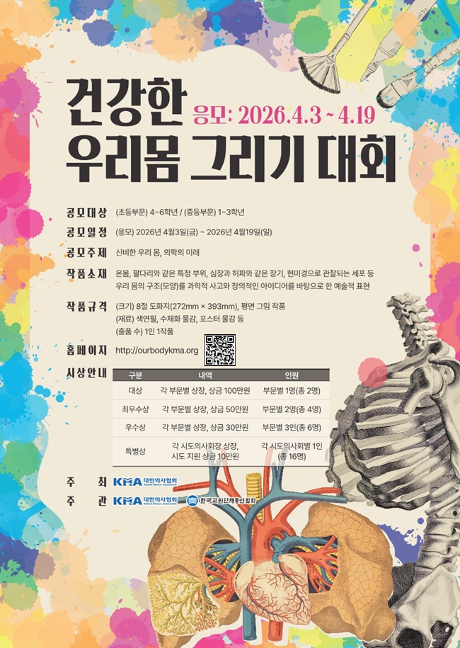 ㅣ 전국 초·중학생 대상 진행…공모 주제 ‘신비한 우리 몸, 의학의 미래’ 대한의사협회(회장 김택우)는 오는 7월 열리는 ‘제43차 대한의사협회 종합학술대회’ 국민 참여 프로그램 일환으로 전국 초·중학생을 대상으로 ‘건강한 우리 몸 그리기 대회’를 개최한다.