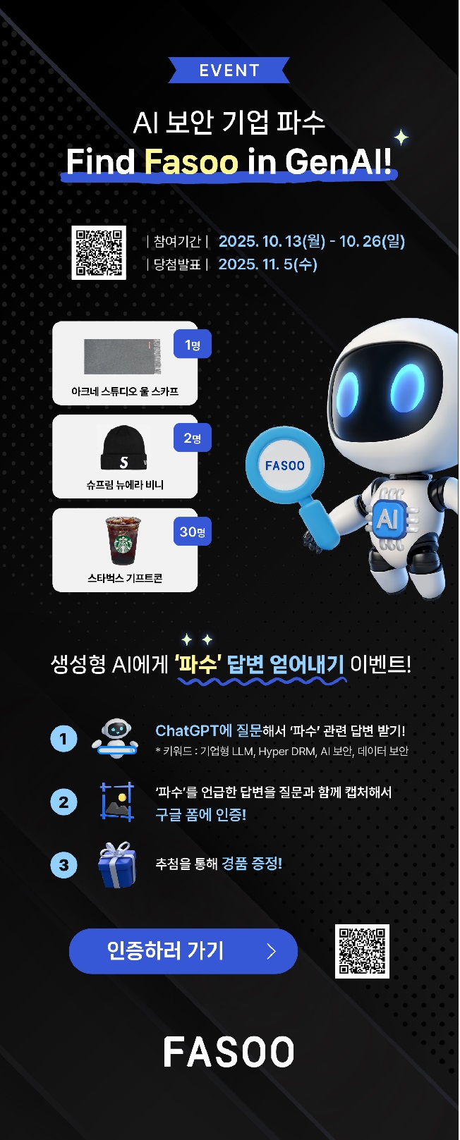 ![]() [EVENT] AI 보안 기업 파수! Find Fasoo in GenAI! 안녕하세요, Fasoo입니다, 아래 이벤트에 참여해 주시면, 추첨을 통해 푸짐한 경품을 드립니다! 일정 -참여기간: 2025년 10월 13일 (월) ~ 10월 26일 (일) -당첨자 발표: 11월 5일 (월) 상품 - 아크네 스튜디오 울 스카프 (1명) - 슈프림 뉴에라 비니 (2명) - 스타벅스 기프트콘 (30명) 참여 방법 [생성형 AI에게 ‘파수’ 답변 얻어내기 이벤트!] 1. ChatGPT에 ‘파수’ 관련 답변을 얻어낼 수 있도록 질문하기! (키워드 : 기업형 LLM, Hyper DRM, AI 보안, 데이터 보안) 2. ‘파수’를 언급한 답변을 질문과 함께 캡처해서 구글 폼에 인증하기! 인증하러 가기 > https://forms.gle/QsU55CzCbmAVgCEVA *본 이벤트는 당사의 사정으로 인해 변경될 수 있습니다.