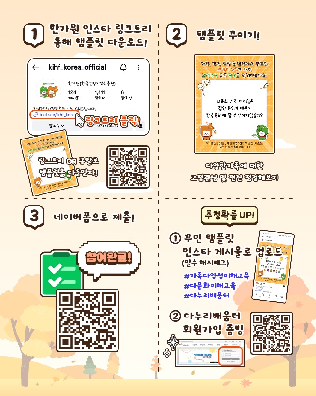 ![]() ![]() 가정, 학교, 직장 등 일상 속에서 ‘다양한 가족’에 대해 우리가 가진 고정관념 혹은 편견을 점검해보는 캠페인이 진행됩니다 이벤트 기간 2025년 10월 20일(월) ~ 2025년 10월 31일(금) 참여 대상 누구나 참여 가능 🧡참여방법 1️⃣ 한가원 인스타그램(@kihf_korea_official) 프로필 *링크트리(Linktree)에서 템플릿 다운받기 클릭 혹은 템플릿 큐알코드 찍고 템플릿 다운로드하기 2️⃣ 다운로드한 템플릿에 ‘다양한 가족에 대한 고정관념 또는 편견 적어보기(+스티커도 좋아요!) 3️⃣ 완성한 템플릿 이미지를 네이버폼에 업로드하면 참여 완료! 추첨 확률 높이는 TIP! 1. 꾸민 템플릿 이미지를 인스타그램 게시물로 업로드! 해시태그를 꼭 함께 작성해주세요. #가족다양성이해교육 #다문화이해교육 #다누리배움터 2. 다누리배움터 회원가입 인증!(회원가입을 축하합니다 화면 캡쳐) 경품 편의점(CU) 모바일상품권 1만원(총 100명 추첨 제공) * 당첨자 발표 : 2025년 11월 7일(금) 예정 본 이벤트는 한국건강가정진흥원에서 추진하는 ‘2025 다양한가족 인식개선 캠페인’의 일환으로, 1차 「전지적 이해 시점」에 이어 이번 2차 「전지적 공감 시점」이 진행됩니다. 11월에는 마지막 3차 「전지적 실천 시점」 캠페인도 이어질 예정이오니 지속적인 관심과 참여 바랍니다. 다양한 가족을 이해하고, 공감의 시선으로 함께하는 여러분의 참여를 기다립니다:)