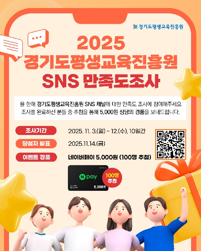 ![]() 이벤트]경기도평생교육진흥원 SNS 만족도조사 이벤트 (11/3(월) ~ 11/12(수), 네이버페이 포인트 5,000원 100명 추첨!) 올 한해 경기도평생교육진흥원의 SNS 채널에 보내주신 성원에 감사드립니다 1,400만 경기도민의 평생학습 파트너인 경기도평생교육진흥원의 각종 SNS 채널을(블로그, 인스타그램, 페이스북, 카카오톡, 유튜브 등) 이용하면서 느꼈던 다양한 의견을 남겨주시고 만족도조사에 참여해주세요! 참여해주신 분들 중 추첨을 통해 총 100분을 선정하여 네이버페이 포인트 5,000원을 보내드립니다!! 조사기간 : '25.11.3.(월) ~11.12.(수) 응모방법 ① 경기도평생교육진흥원 SNS를 팔로우하기(블로그, 인스타그램, 페이스북, 카카오톡 채널, 유튜브 중 1개 이상) ② 만족도조사 URL을 클릭하여 참여완료하기 (만족도조사 URL : https://forms.gle/ozqPQGKUj4UzwHpv6) 당첨자발표 : '25.11.14.(금) (경품지급일 : '25.11.17.(월) 이후 예정) 이벤트경품 : 네이버페이 포인트 5,000원권(100명) 이벤트 유의사항 - 이벤트 일정 및 경품 내용은 내부사정에 따라 일부 변경될 수 있습니다. - 1인 1회 참여 가능하며, 중복 참여는 불가합니다. - 불법적이거나 비정상적인 이벤트 참여 시 당첨이 취소될 수 있습니다. (이벤트와 무관한 내용 전송, 가짜 명의 생성, 동일 내용 반복 참여 등) - 잘못된 개인정보 입력으로 인해 상품 지급이 되지 않은 경우, 당사에서 책임지지 않습니다. - 보내주신 내용은 추후 경기도평생교육진흥원의 업무 참고자료로 활용될 수 있습니다. 여러분의 많은 참여 바랍니다