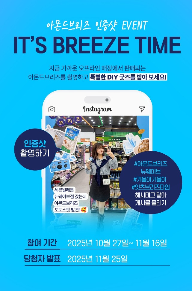 ![]() 🪞거울아 거울아~ 지금 가장 특별한 순간은? #잇츠브리즈타임 가까운 오프라인 매장에서 아몬드브리즈 인증샷을 남기고, 스페셜 굿즈 챙겨가세요! IT’S BREEZE TIME - 인증샷 이벤트 참여 기간: 2025.10.27 ~ 2025.11.16 당첨자 발표: 2025.11.25 (100명/ 랜덤 추첨) 경품: 아몬드브리즈 스페셜 굿즈 (+ 굿즈 인증샷 업로드 시 아몬드브리즈 제품 1BOX 증정) ️ 참여 방법 ① 세븐일레븐 뉴웨이브(명동·역삼) 포토스팟에서 거울 인증샷 촬영 또는 오프라인 매장에서 구매 인증샷 촬영 ② 아브 계정 & 필수 해시태그와 함께 인스타그램 피드에 업로드 #아몬드브리즈뉴웨이브 #거울아거울아 #잇츠브리즈타임 아몬드브리즈(@AlmondBreezekorea) 아브 거울 포토스팟에서 좀 더 특별한 #잇츠브리즈타임 을 담아보세요 포토스팟 위치 • 역삼점: 서울 강남구 언주로 517 1층 • 명동점: 명동역 9번 출구 앞 (호텔 스카이파크 명동 3호점 검색)