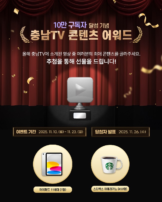 ![]() [EVENT] 10만 구독자 달성 기념 충남TV 콘텐츠 어워드 올해 충남TV에 소개된 영상 중 여러분의 최애 콘텐츠를 골라주세요‼️ 추첨을 통해 선물을 드립니다! 이벤트 기간: 25. 11. 10. (월) ~ 11. 23. (일) 당첨자 발표: 25. 11. 26. (수) 이벤트 참여 방법 1️⃣충남TV 구독 https://www.youtube.com/@topcnitv 2️⃣ 이벤트 영상에 댓글 달기 https://youtu.be/Psu-ed3NbIA 3️⃣ 콘텐츠 투표 & 구독 인증하기 https://promotionm.kr/