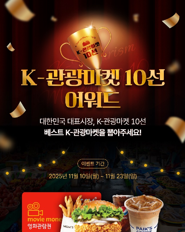 ![]() K-관광마켓 투표하고 선물 받아가세요~! 이벤트 참여방법 ① K-관광마켓 10선 살펴보기 ② 가장 마음에 드는 K-관광마켓에 투표하면 끝! 이벤트 참여기간: 2025년 11월 10일(월) ~ 2025년 11월 23일(일) 당첨자 발표: 2025년 11월 27일(목) 이벤트 경품: CGV 영화관람권 10명, 맘스터치 햄버거 쿠폰 30명, 빽다방 음료 쿠폰 60명 많은 관심과 참여 부탁드립니다~