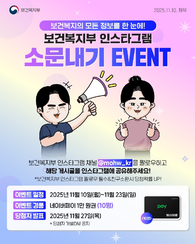 ![]() 보건복지의 모든 정보를 한눈에! 보건복지부 인스타그램 소문내기 EVENT 보건복지부 인스타그램 채널 @mohw_kr을 팔로우하고 해당 게시글을 인스타그램에 공유해주세요! 이렇게 하면 참여 완료! 1️⃣ @mohw_kr 팔로우 필수 2️⃣ 이 게시글을 개인 인스타그램에 공유하기 *리그램 및 스토리 공유 후 캡쳐! 3️⃣ 구글폼 링크(URL)에 공유 캡쳐본과 공유한 게시글 링크 제출하기 https://forms.gle/h3b4YLG6ZxGvodgy9 *친구 소환하면 당첨 확률 UP!️ 기간 : 2025.11.10.(월) ~ 11.23.(일) 당첨자 발표 : 2025.11.27.(목) *당첨자 개별 DM 안내 이벤트 경품 : 네이버페이 1만원권 (총 10명) ️ 팔로우 필수! 당첨 확인 시 팔로우가 되어 있지 않으면 당첨이 취소될 수 있습니다.