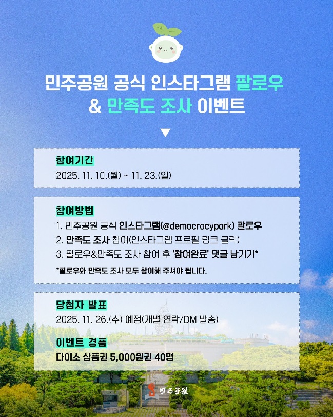 민주공원 공식 인스타그램 팔로우 & 만족도 조사 이벤트