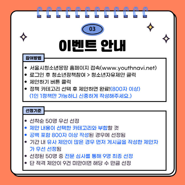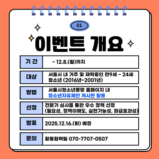 기간 ㅣ ~2025.12.8.(월)까지 대상 ㅣ 서울 거주 또는 재학 중인 만 9세~24세 청소년(2016년~2001년생) 방법 ㅣ 서울시청소년몽땅 홈페이지 내 청소년자유제안 게시판 활용 링크 ㅣ https://www.youthnavi.net/customer/policy/proposal