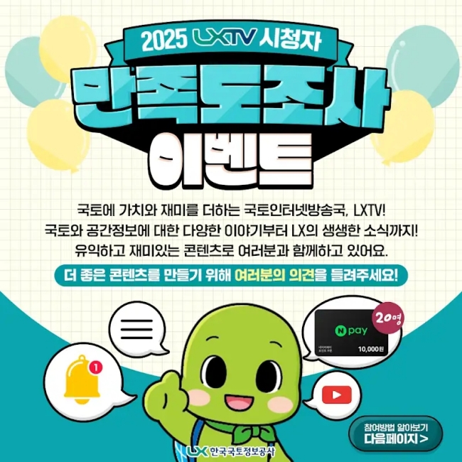이벤트 참여 방법 1️⃣ LX한국국토정보공사 유튜브 구독하기(기존 구독자도 참여 가능) 2️⃣ 2025 LXTV 만족도조사 참여하기 *이벤트폼: https://forms.gle/82GtntETKF3MM3Qc6 3️⃣ 이벤트 커뮤니티 게시물에 참여 완료 댓글 남기기