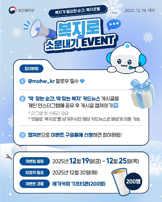 ![]() ![]() 복지로를 부탁해! '딱 맞는 순간, 딱 맞는 복지' 카드뉴스 시청 후 공유하기 EVENT '딱 맞는 순간, 딱 맞는 복지' 카드뉴스 시청 후 인스타그램에 공유해주세요! 인증하면 추첨을 통해 선물을 드립니다 카드뉴스를 확인하고 싶다면? 댓글에 '복지로'를 남겨주세요! 이렇게 하면 참여 완료! 1️⃣ @mohw_kr 팔로우 필수 2️⃣ '딱맞는 순간, 딱 맞는 복지' 카드뉴스 게시글을 개인 인스타그램에 공유 후 게시글 캡쳐하기 *리그램 및 스토리 공유 후 캡쳐! 3️⃣ 캡쳐본으로 이벤트 구글폼에 신청하면 참여 완료! https://forms.gle/bPoVuvmN9CPntDz97 *친구 소환하면 당첨 확률 UP!️ 기간 : 2025.12.19.(월) ~ 12.25.(목) 당첨자 발표 : 2025.12.30.(목) 이벤트 경품 : 메가커피 기프티콘 (총 200명) ️ 팔로우 필수! 당첨 확인 시 팔로우가 되어 있지 않으면 당첨이 취소될 수 있습니다.