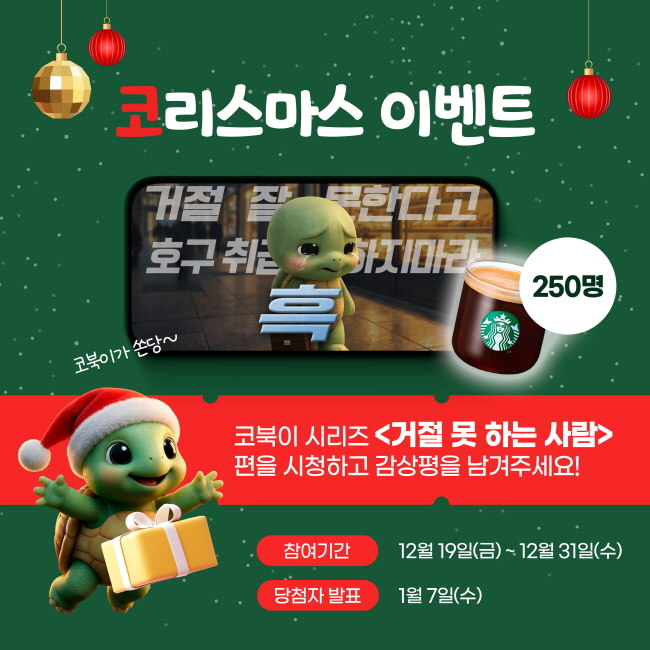 이벤트 기간 : 12/19(금)~12/31(수) 당첨자 발표 : 1/7(수) 영상 고정댓글 경품 : 스타벅스 아메리카노 250명 |