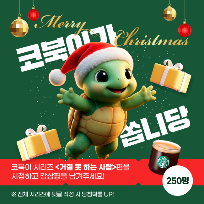![]() ![]() 참여 방법 STEP 1. 영상 시청하고 구독과 좋아요 누르기 STEP 2. 영상 시청 후 감상 댓글 작성 코북이 시리즈 전체에 댓글달면 당첨 확률 UP! STEP 3. 구독, 댓글 인증샷과 함께 선물 받을 정보 입력하기 이벤트 참여 인증 URL: https://naver.me/5owHza1e