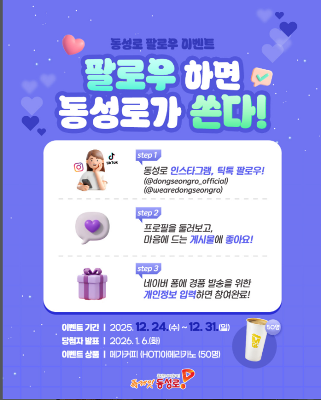 ![]() 동성로에 관한 모~든 정보를 다 만날 수 있다! 지금 '동성로' SNS 팔로우 하고 인증샷을 올리면 추첨을 통해 50명에게 메가커피 핫 아메리카노를 드려요! 네이버 폼 바로가기 https://naver.me/G281crGx 참여방법 1️⃣ 동성로 인스타그램(@dongseongro_official), 틱톡(@wearedongseongro) 팔로우 하기 2️⃣ 마음에 드는 게시물에 좋아요 및 댓글 남기기 3️⃣ 네이버 폼에 인증샷 및 개인정보 제출하기 이벤트 기간 : 2025. 12. 24.(수) ~ 12. 31.(수) ⏰ 당첨자 발표 : 2026. 1. 6.(화) 이벤트 상품 : [메가커피] 핫 아메리카노(50명) ※ 이벤트 당첨 상품은 7일 이내 발송 예정입니다. ※ 이벤트 참여 시 기재한 연락처로 발송되며, 잘못된 연락처 입력으로 인한 상품 오배송은 책임지지 않습니다.