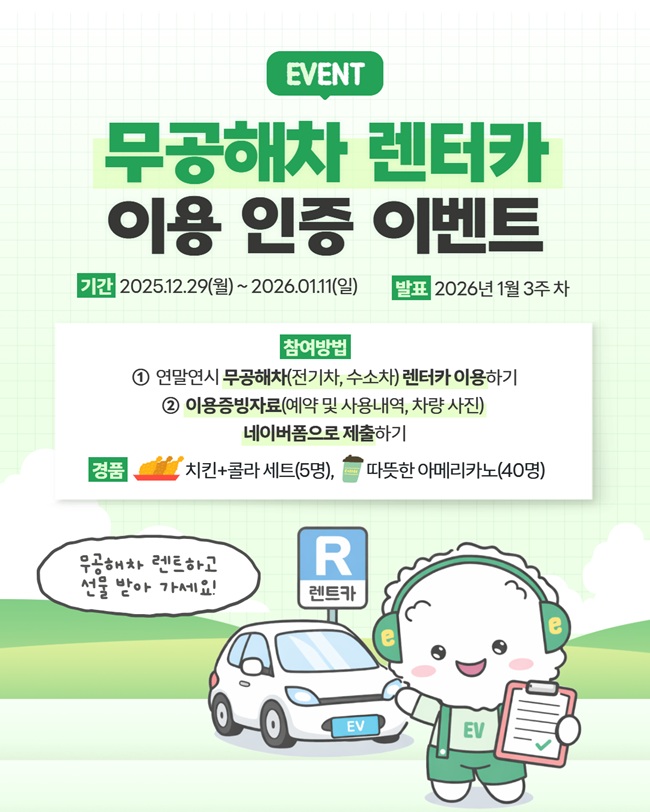 참여 방법 ① 연말연시 무공해차(전기차, 수소차) 렌터카 이용하기 ② 이용증빙자료(예약 및 사용내역, 차량 사진) 네이버폼으로 제출하기 네이버폼 링크: https://naver.me/ID3ZtUrk ③ 해당 게시물 왼쪽의 전기차 렌트 릴스 영상을 감상하고 댓글을 작성하면 당첨 확률 UP!⬆️ 영상 링크: https://bit.ly/4pixmc9