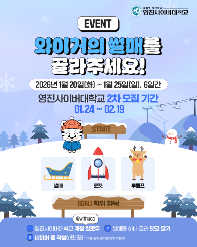 참여 방법 : ① 영진사이버대학교 계정 팔로우 ② 썰매를 하나 골라 댓글 달기 ③ 인스타 프로필 링크를 통해 네이버 폼 작성하면 끝! *마케팅 활용 동의하면 당첨 확률 UP