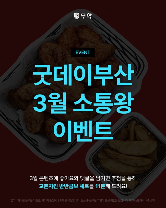 3월 업로드 콘텐츠에 좋아요와 댓글을 마구마구 남겨주신 분 중 추첨을 통해 총 11분께 교촌치킨 반반콤보 웨지감자 세트를 드려요