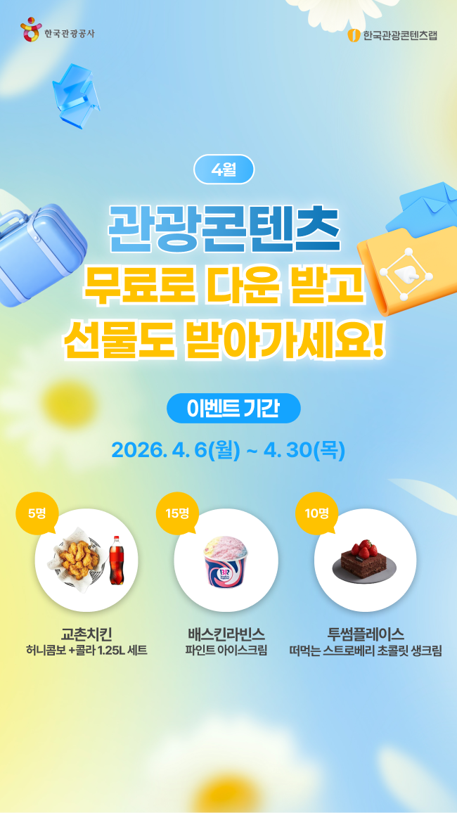 - 한국관광공사의 다양한 관광콘텐츠를 다운로드하면 추첨을 통해 푸짐한 상품을 드립니다!