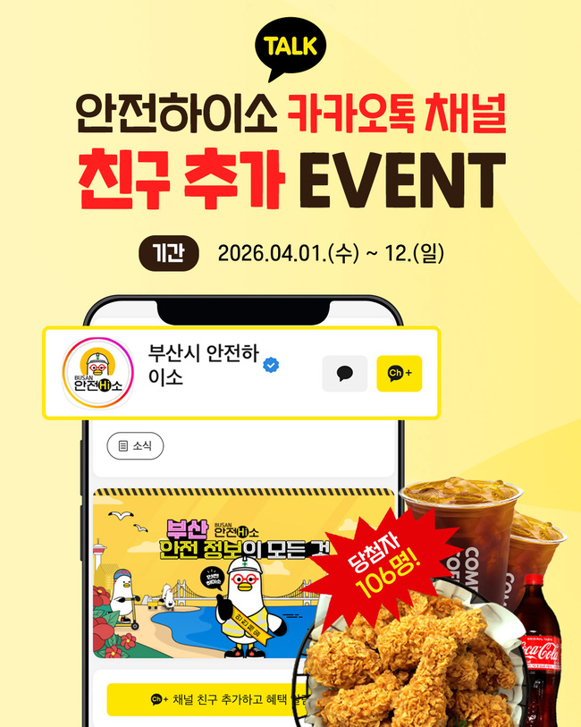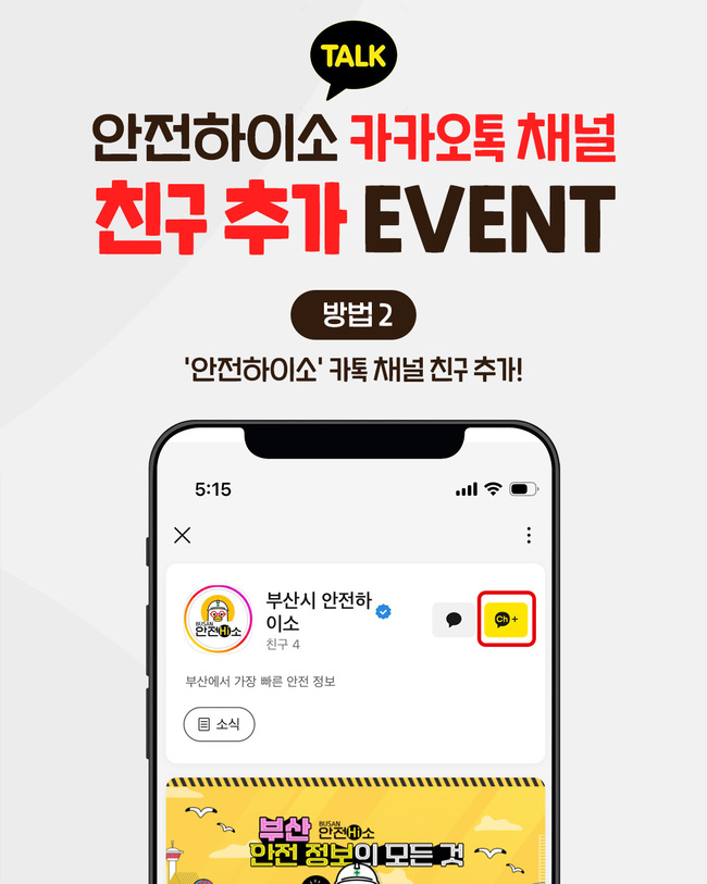 부산의 안전 소식, 누구보다 빠르게! 지금 바로 '안전하이소' 채널 친구 추가하고, 재난·위기 상황 대응 정보는 물론 푸짐한 경품까지 챙겨가세요!