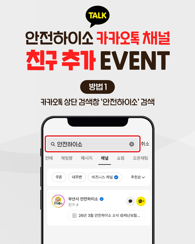 참여 방법 - 카카오톡 상단 돋보기에서 '안전하이소' 검색! - '부산시 안전하이소' 채널 친구 추가 꾸욱! - 추가된 화면 캡쳐 후 네이버 폼 작성하면 끝! *공유하면 당첨 확률 UP! UP!