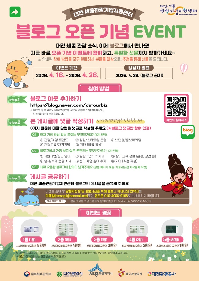 대전·세종 관광 소식, 이제 블로그에서 만나요! 지금 바로 오픈 기념 이벤트에 참여하고, 특별한 선물까지 받아가세요~ ※ 안내된 참여 방법을 모두 완료하신 분들을 대상으로, 추첨을 통해 선물을 드립니다.