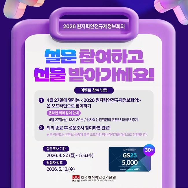 <<이벤트 참여 방법>> 1. 2026 원자력안전규제정보회의에 참여하기 ( 온라인 ) 일시 : 2026년 4월 27일(월) 오후 1시 30분 장소 : 유튜브 '원자력안전위원회' 채널에서 라이브 생중계 시청