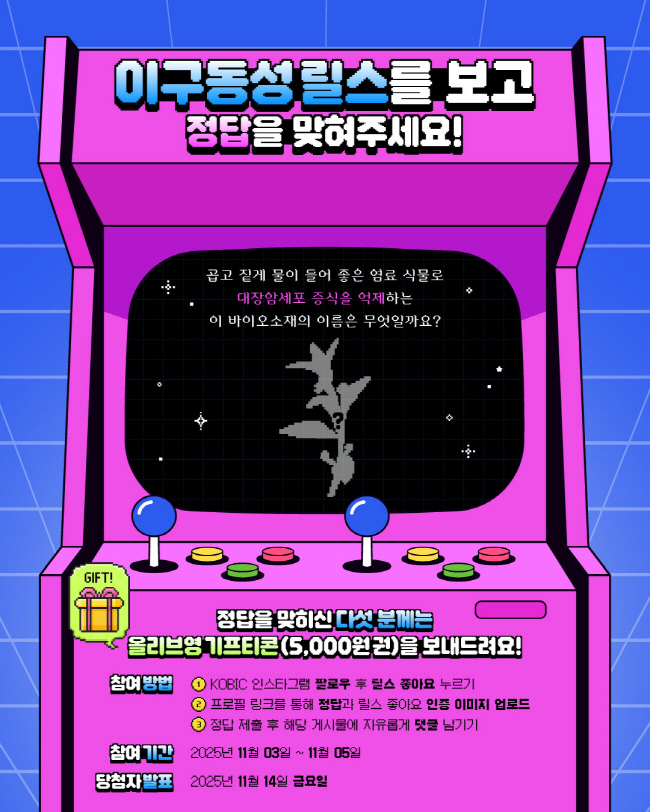 힌트 : 바이오소재 설명을 유심히 봐주세요🧐 경품 올리브영 상품권 참여 방법 'KOBIC 인스타그램 팔로우' 후 '릴스 좋아요' 누르기 프로필 링크를 통해 '정답'과 '릴스 좋아요 인증 이미지 업로드' 정답 제출 후 해당 '게시물에 자유롭게 댓글 남기기' 참여 기간 2025년 11월 03일 ~ 11월 05일 당첨자 발표 2025년 11월 14일 [주의 사항] 중복 참여 불가 (동일 IP 포함)