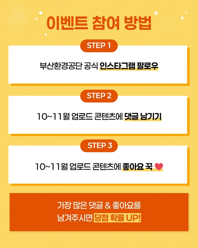 이벤트 참여 방법 ① 부산환경공단 공식 인스타그램 팔로우 ② 10~11월 업로드 콘텐츠에 댓글 남기기 ③ 10~11월 업로드 콘텐츠에 좋아요 꾹! ※ 본 게시물 내 남겨주시는 댓글은 인정되지 않아요!